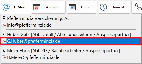 Wählen Sie in der Liste den entsprechenden Ansprechpartner und E-Mailadresse aus, die E-Mail wird anschließend mit dem gewünschten Empfänger wird geöffnet: