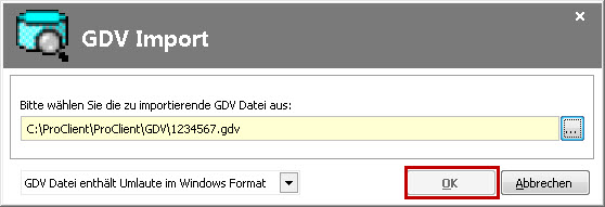 Die gewünschte GDV-Datei auswählen und mit „OK“ einlesen.