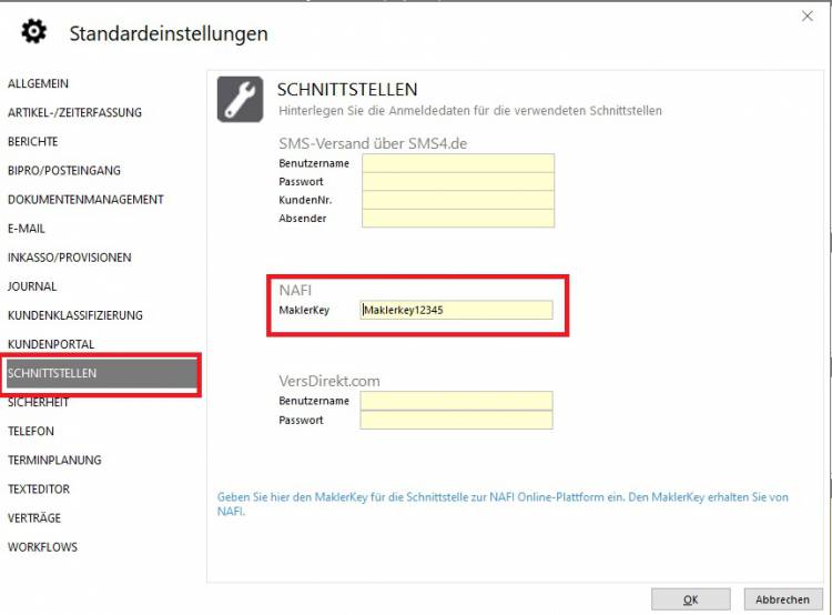 „Zahnrad“ → „Standardeinstelunngen“ → „Schnittstellen“ → „NAFI - MaklerKey“