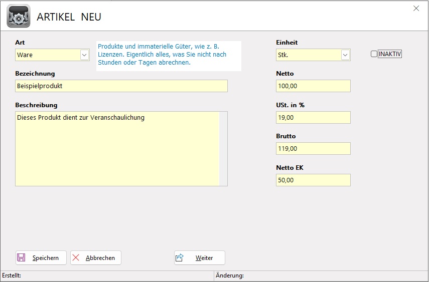 Waren- und Tätigkeiten anlegen