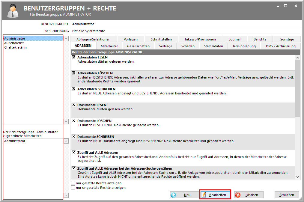 Rechte von einer Benutzergruppe bearbeiten